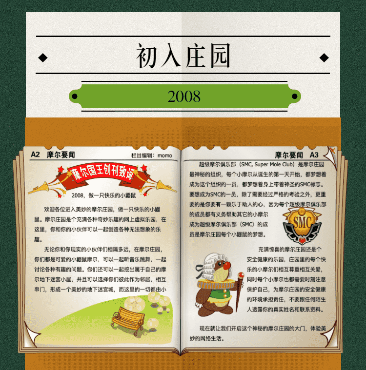 在这一年,,,摩尔庄园诞生了。。。。在这里,,,,大家都是可爱的红鼻子鼹鼠小摩尔,,可以一起勤劳耕作,,一起高山滑雪......我们都是摩尔庄园的建设者。。。