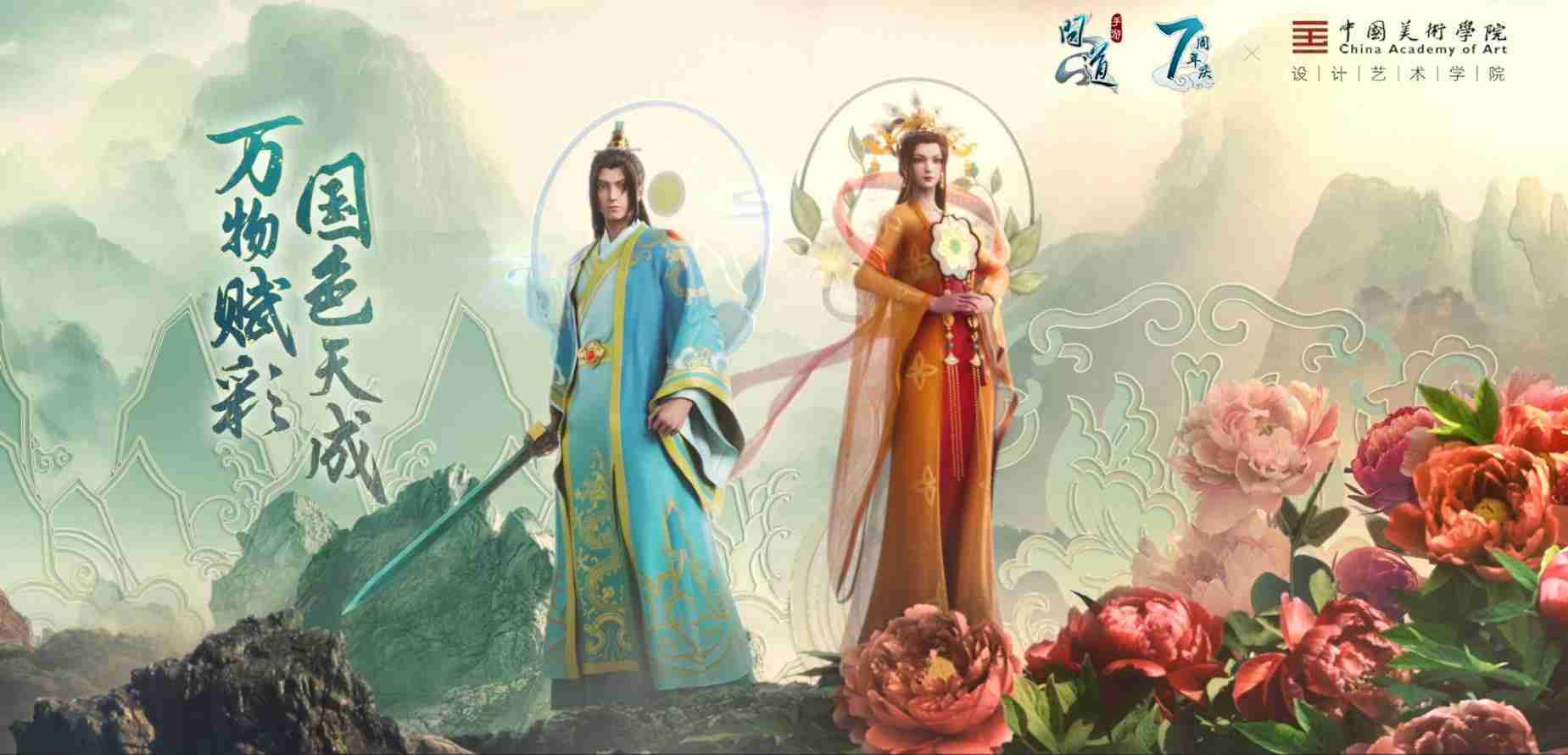 2023年4月,,,,《问道手游》联动中国美术学院,,在游戏中融合了中国历史上不同时期的文化元素,,,,打造了“山河万象”与“凤鸣九霄”的国风时装。。。在色彩配置方面,,,创作团队基于对游戏角色特性的分析提取相应的文化内涵,,,从每一种色彩的色相、、、指代事物和情感出发对应角色属性,,,选定服装的色彩搭配。。。。在纹样设计方面,,,,创作团队结合游戏角色自身特殊的造型比例和形态,,,,在实际的纹样设计中进行了游戏语境下的活化演绎。。。。男性角色集中使用了如蟒纹、、、海水江崖纹、、、、如意纹和云气纹等传统纹样元素,,,女性角色则吸纳了凤凰纹、、牡丹纹、、、、卷草缠枝纹等元素,,,组成以“双凤牡丹纹样”“缠枝牡丹纹”“金玉凤冠头饰”为主要纹样的游戏角色装饰图案系统。。。